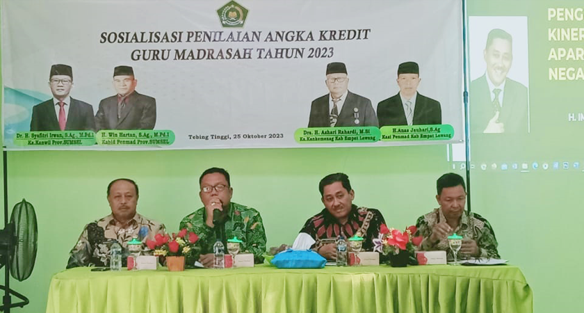 Empat Lawang, Humas. Kantor Kementerian Agama Kabupaten Empat Lawang melalui Seksi Penmad melaksanakan sosialisasi Penilaian Angka Kredit Guru Madrasah (PAGM) tahun 2023 yang diikuti oleh Madrasah dan Guru dilingkungan Kemenag Empat Lawang bertempat di Aula Kemenag Empat Lawang, Rabu (25/10).